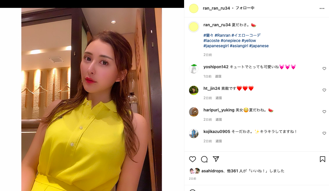 原蜜美杏,现在改名为蘭々的她也在IG分享了自己的twitter,所以就她无误