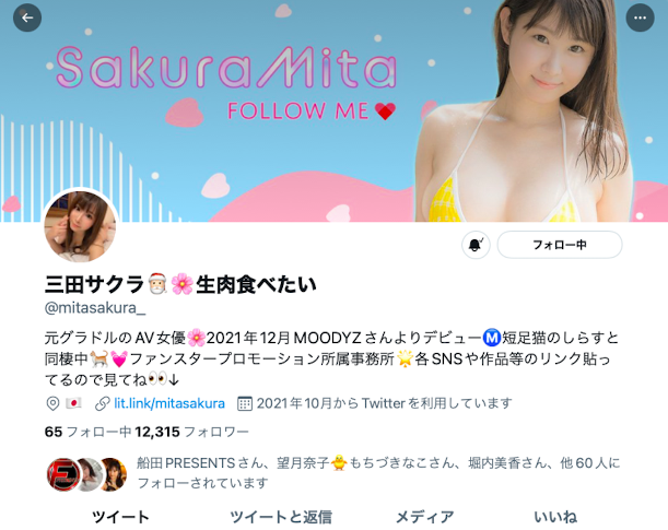 第一个要注意的应该是写真偶像出身的「三田サクラ(三田樱)」,一来她没有在该发片的时间出现(九月第一档),二来她到目前9支专属作品的发片数也到了要检讨去留的时候,最后也是最重要的是她的twitter自我介绍栏现在只剩下「2021年12月Moodyz出道」而不是Moodyz专属女优了:
