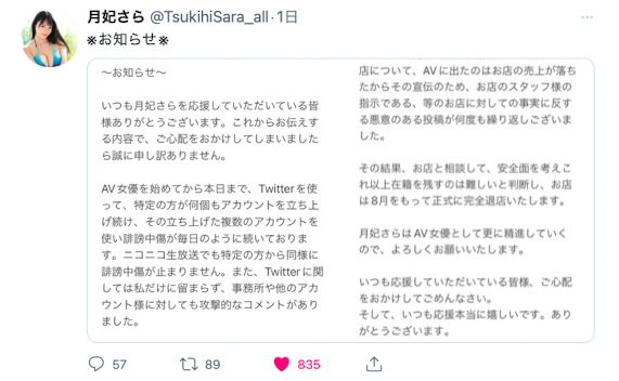 昨天,在片商Oppai出道、号称出道前在风俗界横着走的月妃さら(月妃纱罗)就公开发表了退职宣言,不是不做女优了,而是离开了风俗界,这本来没什么好张扬的,不过看了公告内容才知道她是被网路上各种毁谤中伤的留言吓坏,基于人身安全的考量所以选择离职,未来就专心做好AV女优的工作⋯很文博客-https://www.hinku.com/34890.html