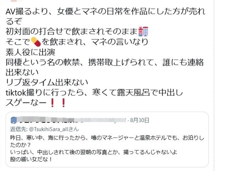虽然留言是的不同帐号,但从语气和留言的内容就知道应该都是同一个人发的,反正就是说月妃さら(月妃纱罗)就是个陪经纪人睡觉的烂货ー先不提事务所都明令禁止经纪人和女优谈恋爱、光是一夜情都会被罚款减薪了,月妃さら(月妃纱罗)所属的AllPro虽然有才刚入行的经纪人,不过以这事务所的规模之大和经纪人之多,说有人和月妃さら(月妃纱罗)整天到处乱跑到处找炮打我真觉得不太可能,但这人就是每天照三餐换帐号留言,不会腻〜