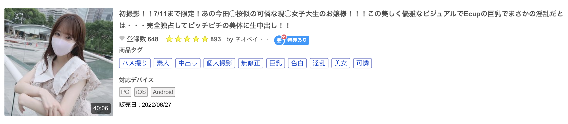 还是老话一句,现在无码片商是步兵界动作最缓慢的单位,比速度他们很难赢过FC2平台那些无码卖家,所以綾野ゆう(绫野悠)自然也不是第一次在镜头前出鲍ー早在去年6月的时候,被说很像「今田美桜」的她就和乙白さやか(乙石彩也香)一样被大神「ネオペイ・・」搞下马了(fc2-ppv-2993293),而且一次不够还两次,去年8月这支「シネマ畫風!この美しく優雅なビジュアルでEcup巨乳現◯女子大生・・・色白美肌を惜しげもなく曬しピッチピチな美体に生中出し&口內射精!!」(fc2-ppv-3074048)的女主角也是她〜