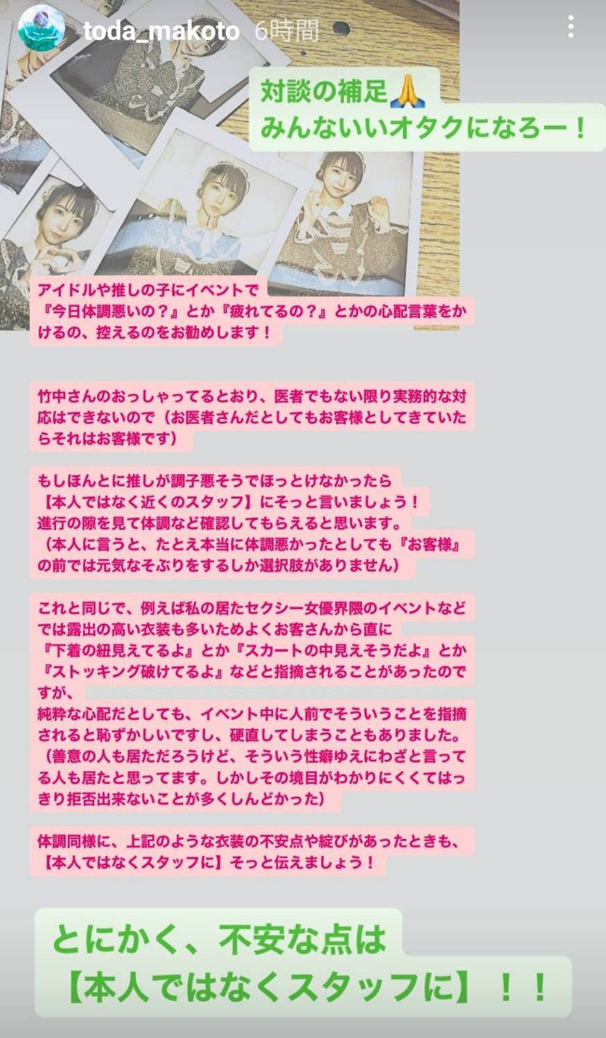 当然啦,这只是戸田真琴的讲法,也不见得每个女优都会这么想,但就我办活动的经验,察觉女优有什么状况、对活动有什么不满还是找现场工作人员或经纪人反应就好,因为女优不会想让影迷知道她有什么状况也不会想当坏人,你自以为是的好意,有些时候造成的后果反而难以预料啊~