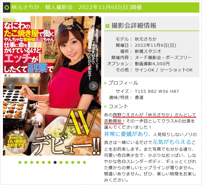 马上来查她的身份:透过社群,我们知道演出的女优名叫「秋元ちさか(秋元千彩花)」,这是一个非常陌生的名字,目前没有twitter,不过膜拜估狗大神就可以知道她最近要举办摄影会,而上面是这么介绍她的:很文博客-https://www.hinku.com/39146.html