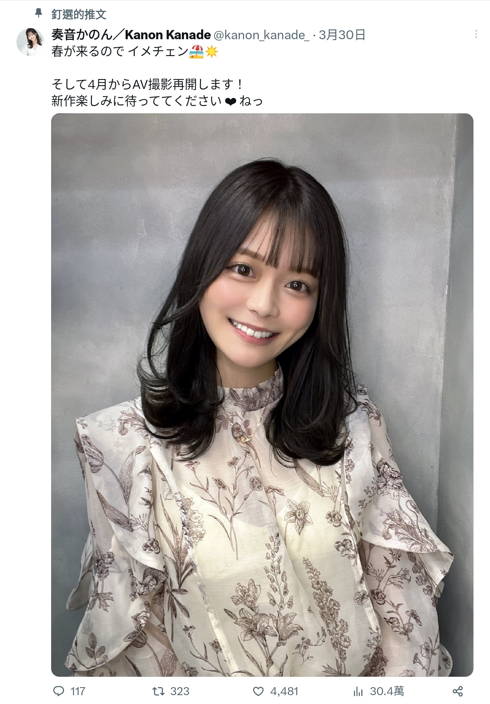 睽违一年,她终于在前天(4/29)进行睽违一年的AV摄影,看起来气色挺不错的,也因为她有详细记录这次回归的过程,所以我们可以说清楚讲明白:她第一次发文说自己要回归拍片的3月30日是她与片商签约的日子,而前天4月29日去拍片是因为与片商签约有一个月的思考期,在这期间女优随时可以反悔不去拍片;然后顺利拍完片子后奏音かのん(奏音花音)的新作品最快会在四个月后发行,也就是说我们应该会在9月看到片子〜很文博客-https://www.hinku.com/40308.html