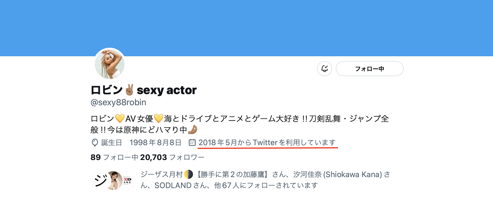 有趣的是她的艺名叫ロビン(Robin),对,就是蝙蝠侠身边的罗宾,为什么要取这样的艺名我真心不理解,而且令人意外的是我以为这样的女优应该没有社群,但奇怪的是她不但可以找到twitter(https://twitter.com/sexy88robin/),而且帐号注册的日期摆明有鬼: