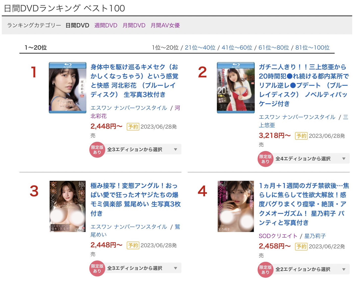 看来即将引退的巨星和知名导演的合作第一天是不敌销售天后被喂食春药,也因为这两位女优争得凶,所以照理来说是众人焦点的「新人」虽然被放在了官网首页,但作品上架第一天的在排行榜上排名没那么前面⋯很文博客-https://www.hinku.com/40803.html