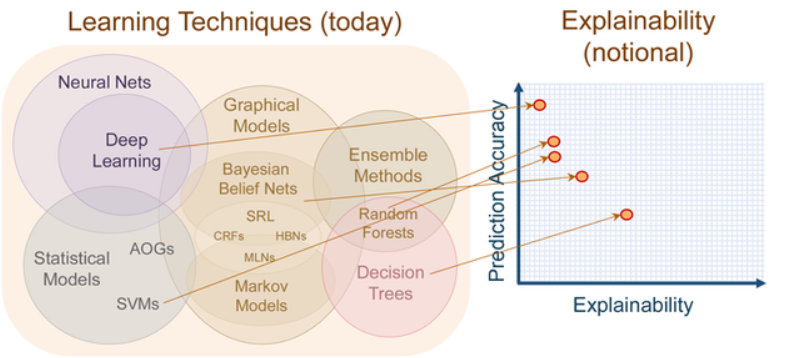 而就算能够实现这种可解读性,也未必是件好事。对可解读性的要求相当于制约了系统的能力,使模型无法仅关注输入输出数据、提供“纯粹”的解决方案,从而有降低精确度之嫌。美国国防部高级研究计划局项目主管戴维·甘宁(David Gunning)曾在一次会议上对此进行了总结。在他展示的图表中,深度神经网络是现代机器学习方法中最难以理解的一种,而以规则为基础、重视可解释性胜过效率的决策树则是最容易理解的一种。