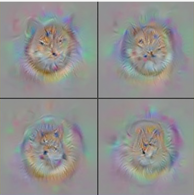 图为“深度视觉化”工具包生成的“理想猫脸”。该程序先从类似电视机没信号时的“雪花”图像开始,对像素进行逐个调整,直到AlexNet神经网络的面部神经元产生最大响应为止。