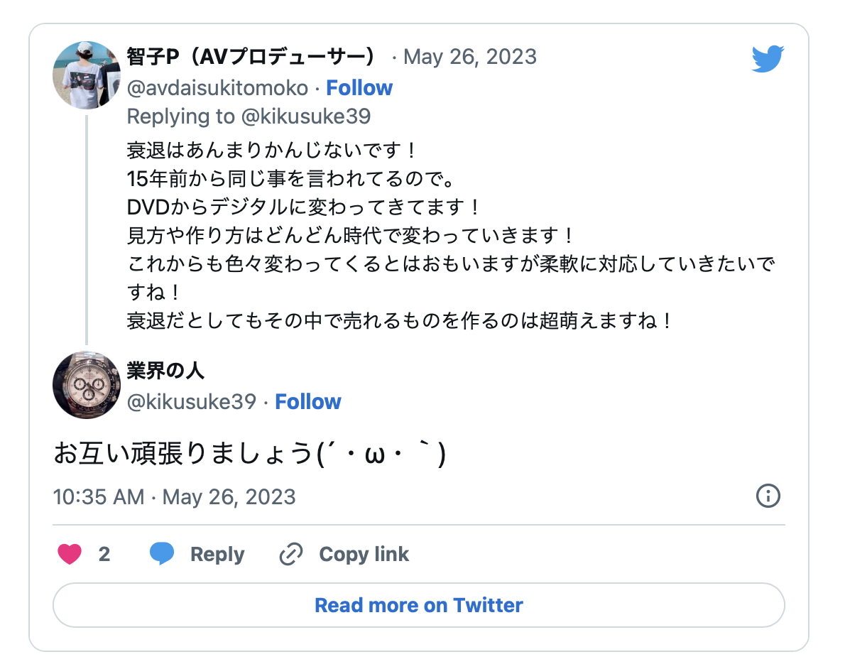 那就是业界有名的制作人「智子P」,在在注意女优twittter的朋友一定看过她,她是这么看「業界の人」这段发言的:「我并没有有感觉到衰退!因为同样的话从15年前就开始说了,从DVD转变为数位的时候,面对时代的改变,想法及做法都要有所因应,今后应该也会有许多变化,要更谨慎地去应对,就算在衰退的时代如果能做出超级卖的片子,那不是让人热血沸腾吗?!」