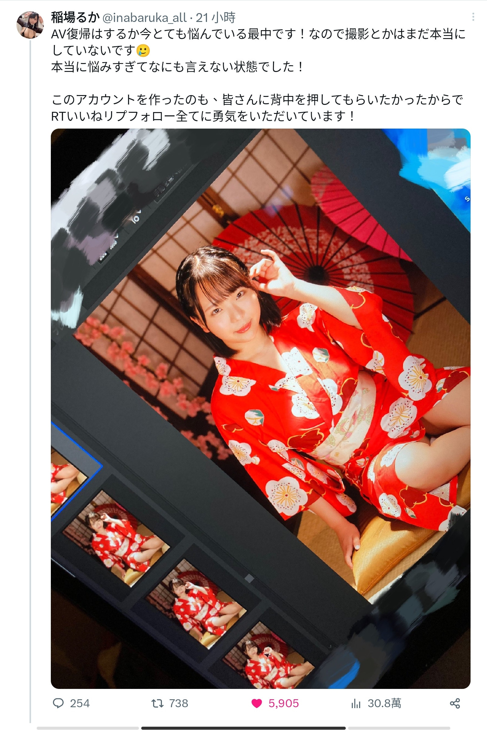 所以从字面上的意思来看稲場るか(稻场流歌)并没有「绝对不拍」,但到现在为止还没有下定决心重返战场;最后究竟会怎么样呢?我想只要再累积多一点粉丝每天有人夸她可爱说想看她拍片就没问题了,我非常乐观,她会复活的!
