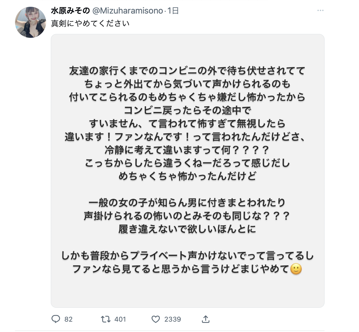 所以水原みその(水原美园)转头过去给那位「粉丝」回眸一笑?不,才没有,水原みその(水原美园)是以「愤慨」来形容自己的感受:「对一般女孩子来说,被陌生男性跟踪或搭讪都很恐怖吧?」但如果那男人真的是粉丝呢?水原强调自己已经讲过很多遍:「活动的时候非常欢迎大家来交流,但其他时候请给我私人的空间,相信粉丝都明白这道理吧?为什么会有人觉得大半夜地搭讪没什么大不了?」
