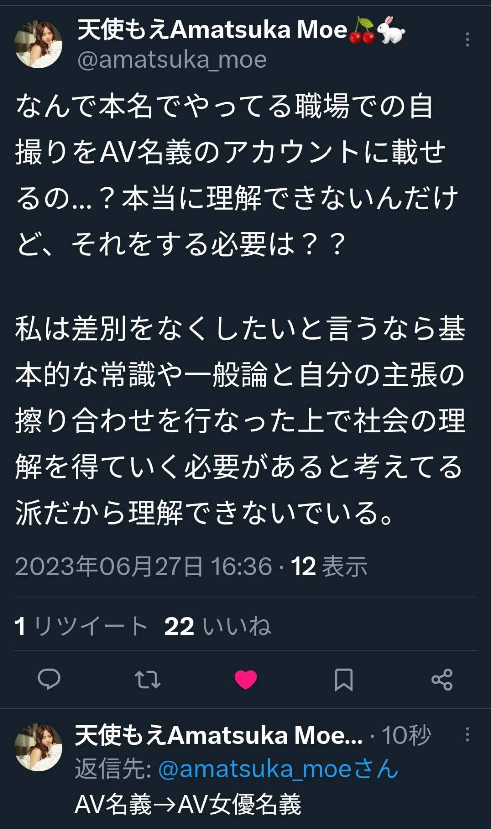 这么说吧,虽然以AV新法时的发言来看天使もえ(天使萌)应该是要力挺藤かんな(藤环奈)的工作权的,但在这事上她与反对新法时的战友月島さくら(月岛樱)看法完全不同,她认为藤かんな(藤环奈)这种用AV女优的帐号曝光真实身份工作状况的做法十分不妥,感觉就像拜托人家把你认出来似的: