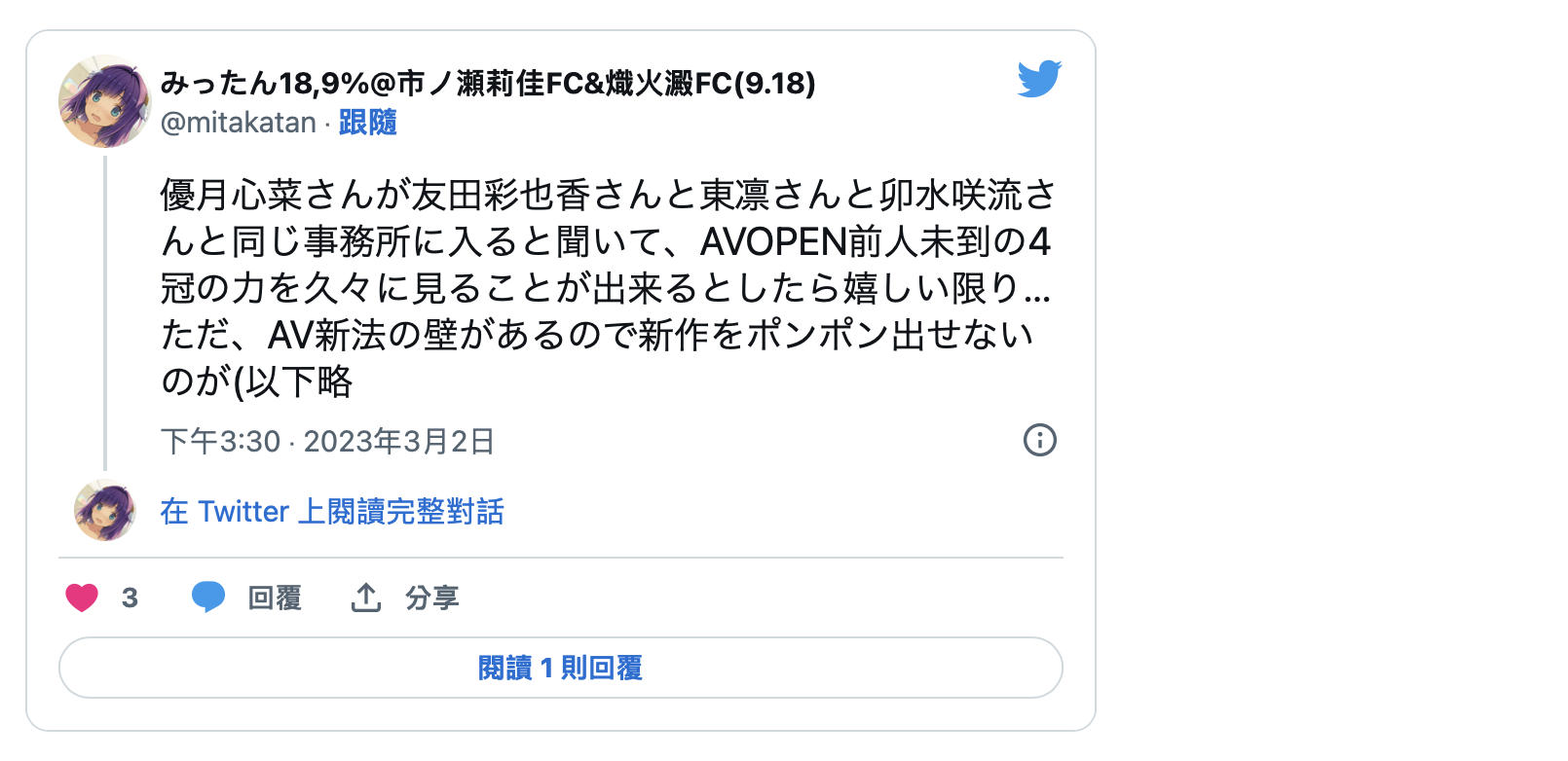 因为Diaz Group这间经纪公司的实力并不强,这一篇twitter的发文就讲了,優月心菜(优月心菜)去的是友田彩也香、卯水咲流和东凛在的经纪公司,这三位女优知名度高不高?高;但她们发展好不好?坦白说除了友田彩也香还待在FALENO集团的熟女片商DAHLIA外其他人的存在感很低;我没有忘了水川润(由爱可奈),同样地,她也是在片商DAHLIA打拼,所以⋯