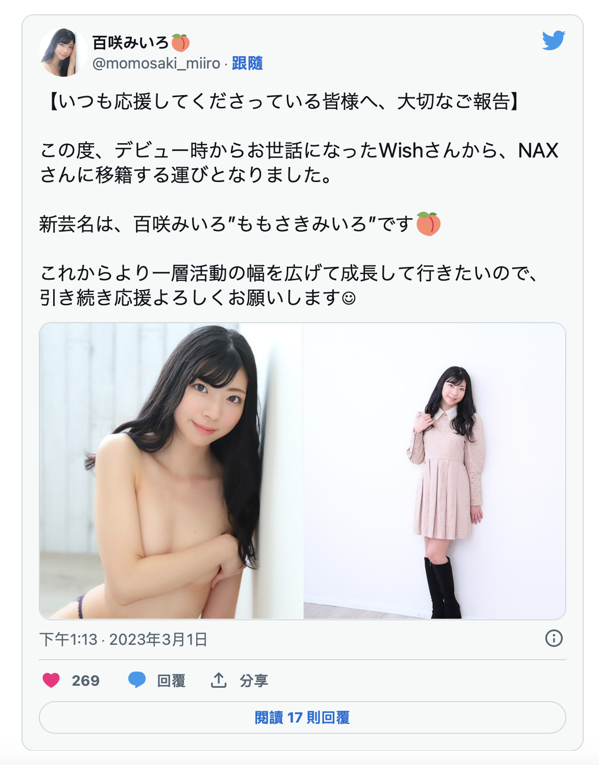 接下来我们看这位百咲みいろ(百咲未色),twitter上写了,她是从原来的事务所Wish跳槽去了NAX,艺名也从七咲みいろ(七咲未色)改为百咲みいろ(百咲未色),以我所了解的AV界,这个移籍应该没有搞到两间经纪公司翻脸,所以百咲みいろ(百咲未色)得以保留绝大多数的艺名,接下来就看看这位自称中学就想当AV女优、被喻为「最强逆封杀(就是本人比封面好看太多)」的女优如何用新的名字在业界立足:很文博客-https://www.hinku.com/43309.html