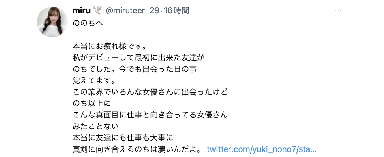 而私底下的她也和片中给人的印象令人舒服,所以她和业界蛮多女优很要好,最著名的应该就是前阵子在台湾摄影会很夯的miruー在闲聊的时候有人问到miru喜欢什么样的男人,miru说她只要有結城のの(结城乃乃)就好,还挽起袖子秀肌肉说:「我是老公,我会保护她(結城のの)的!」