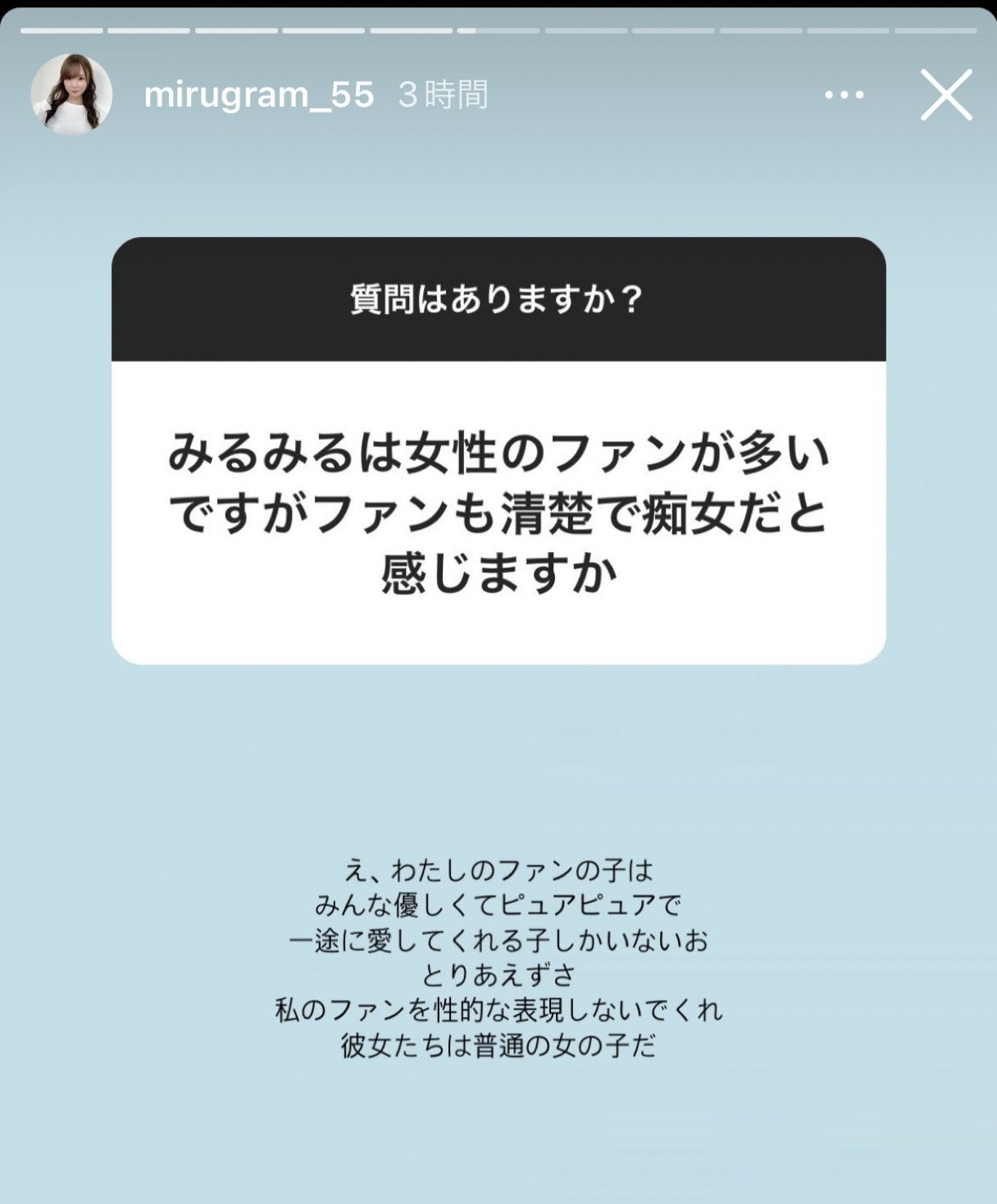 miru怎么说呢?她说自己的女粉都是很温柔、很纯真的好孩子,「她们只是单纯地喜欢我而己」,请不要对她们有任何性幻想甚至骚扰她们,因为她们都是很普通的女孩子⋯很文博客-https://www.hinku.com/43711.html