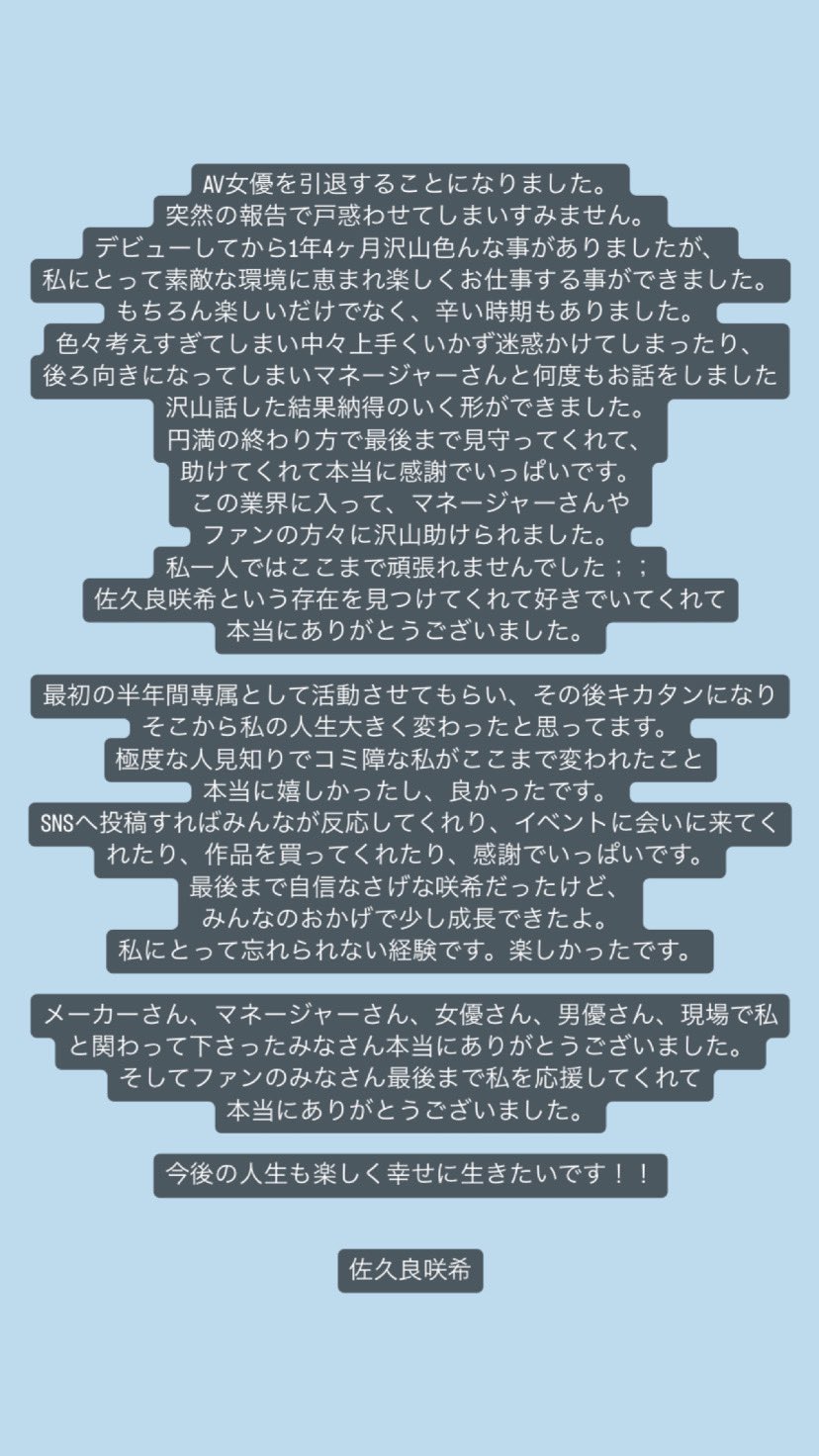 于是她宣布引退,也不用特别去猜有什么原因,就是时间到了,知道自己的极限在哪儿然后也不想再努力了,AV界就是这样,每天都有人出道但也每天都有人不做了。所以我只能说佐久良咲希辛苦了,差不多一年半的时间相信她学到了很多东西,走出事务所的大门,她再也不是那位性经验0.5人的小天真,现在,她已经是斩鸡无数的霸王花了,简称鸡霸〜