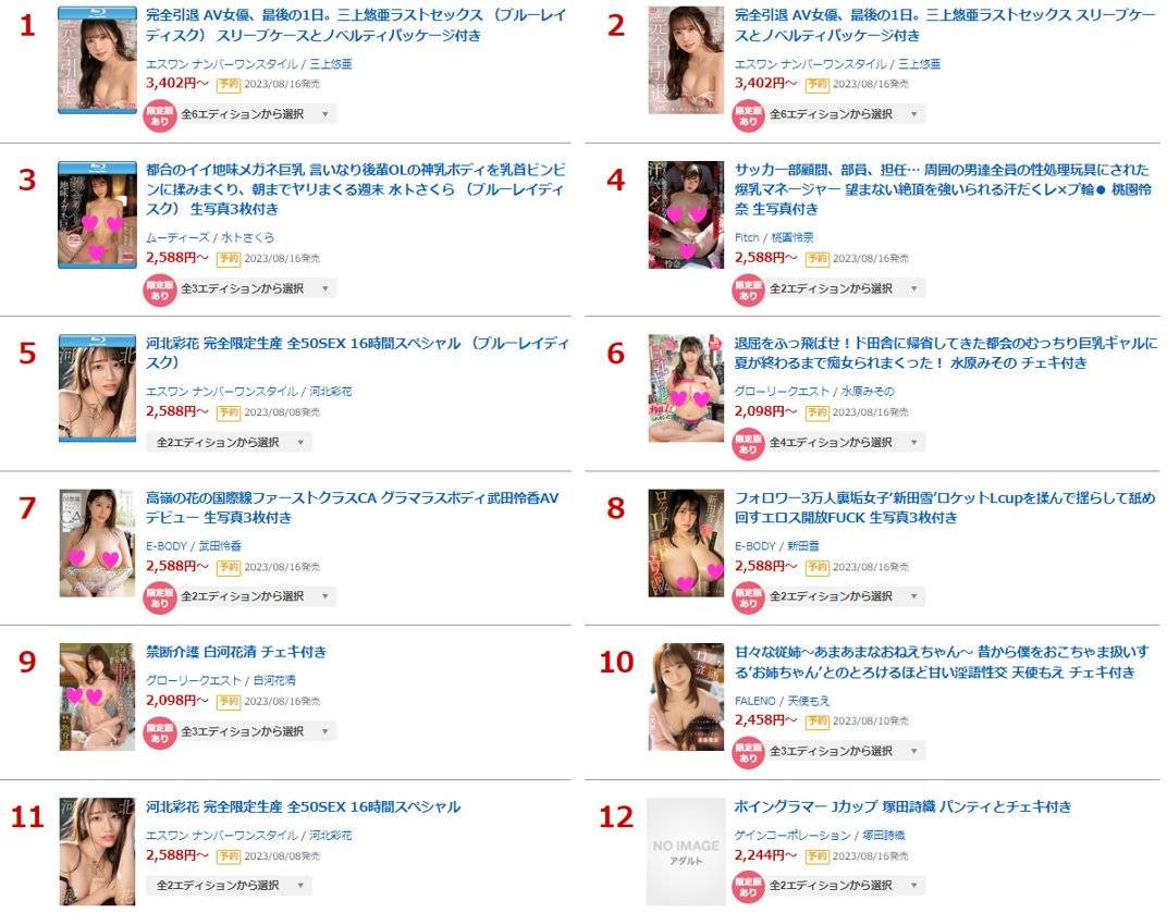 干,这还有什么好猜的?当然是发表引退作的「三上悠亜」,甚至可以这么说,假如她没拿到第一的话那S1上从导演下到作品企划通通都要土下座谢罪;除此之外呢?首先,河北彩花是真的超强,很多女优是发新片力争上游,她却只用精选辑就把大家打爆,蓝光第5加上DVD第11的成绩看似还好,但别忘了她并不是这一档发片的人喔,这成绩应该会让很多女优怀疑人生;再来,水卜さくら(水卜樱)和桃园怜奈还是很稳定,E-Body的新人则是最成功⋯很文博客-https://www.hinku.com/44414.html