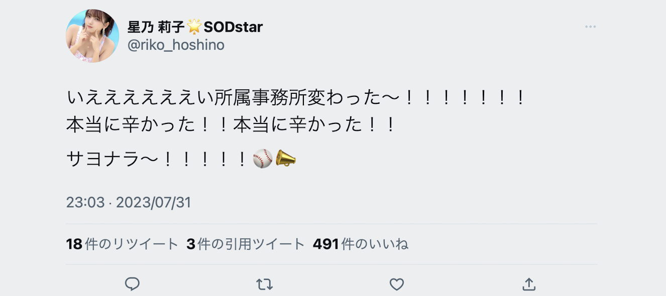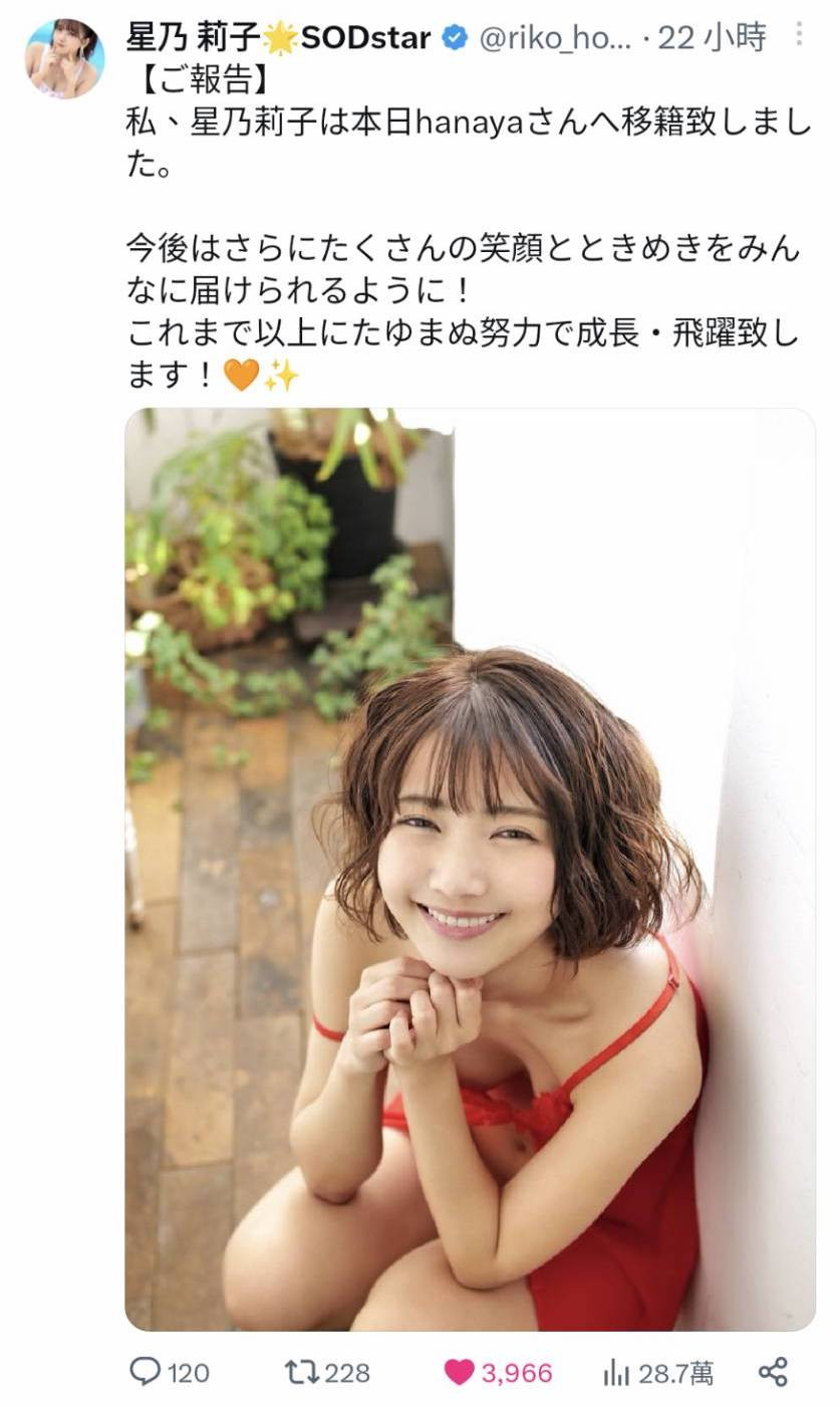 这就是为什么明明只是更换事务所的小动作我却特别拿出来写的原因,因为姫宮すみれ(姬宫堇)写出来的东西是非常强烈的指控,我觉得有必要写出来给大家知道,至于星乃莉子的状况不会有太大变化,她依然是四小天后中的高手高手高高手,SOD STAR不会因为她换了事务所就对她不好,反而有可能因为HANAYA Project的关系对她更好!