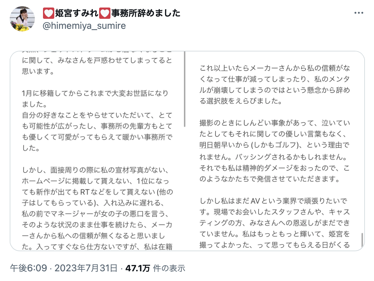 原来她和经纪公司的状况不是很妙,最近更是大量转推女优姫宮すみれ(姬宫堇)的抱怨文,显然是于我心有戚戚焉。然后在7月31日的时候,她发了这么一篇文章(已删除):很文博客-https://www.hinku.com/45208.html