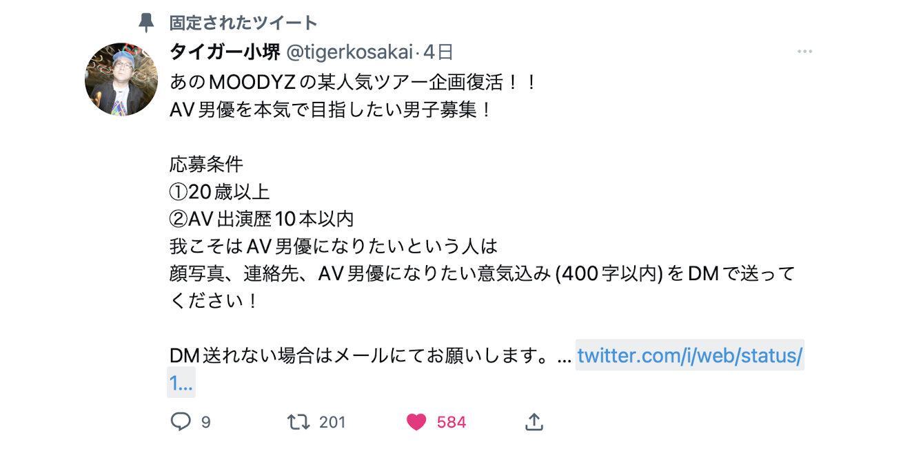 想成为AV男优的人,请把含有你长相的照片、连络的方式以及为什么想成为AV男优的理由(400字之内)以私讯发送给我(タイガー小堺),没办法私讯的人就请寄Email吧!