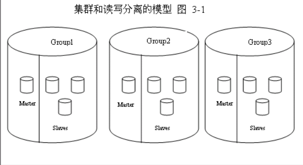 如上图所示,整个数据层有Group1,Group2,Group3三个集群组成,这三个集群就是数据水平切分的结果,当然这三个集群也就组成了一个包含完整数据的DB。每一个Group包括1个Master(当然Master也可以是多个)和 N个Slave,这些Master和Slave的数据是一致的。比如Group1中的一个slave发生了宕机现象,那么还有两个slave是可以用的,这样的模型总是不会造成某部分数据不能访问的问题,除非整个 Group里的机器全部宕掉,但是考虑到这样的事情发生的概率非常小(除非是断电了,否则不易发生吧)。