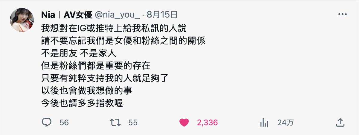 结果活动顺利结束了,Nia和其他AV女优一样收集了大量的流量,但看了她的中文twitter(https://twitter.com/nia_you_)就知道她不是那么开心ー先是被某些影迷乱点鸳鸯谱叫她去找孙生,再来还有两篇明显感觉有点情绪的发文:很文博客-https://www.hinku.com/45982.html