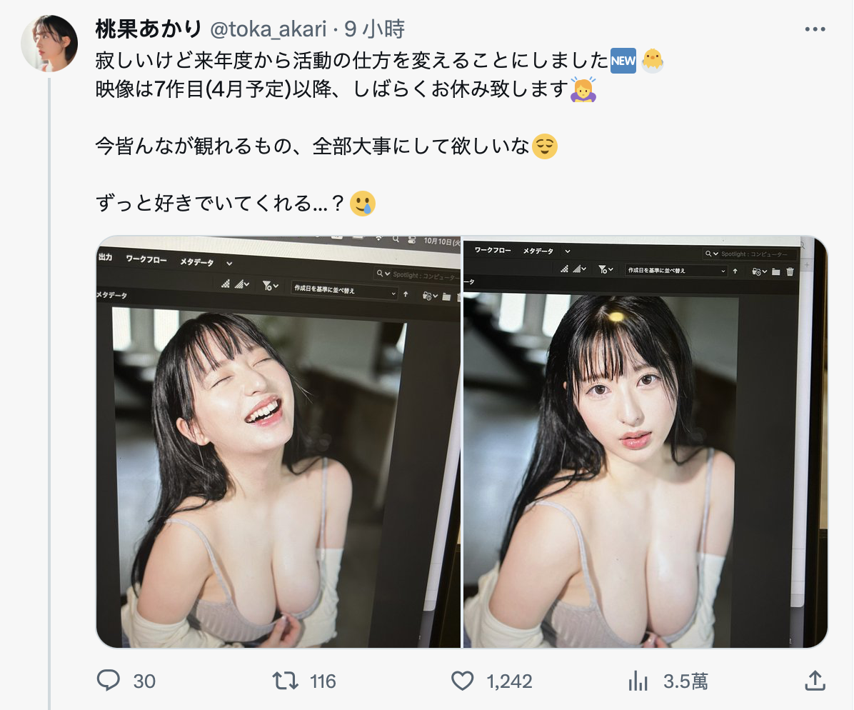 马上来找答案:翻开桃果あかり(桃果明里)的发片清单就知道原因了:首先,她现在已经6支作品了,也就是说除非搞错了,否则她就要长期脱离战线直到明年4月第7支作品上市,与其日后一直被问不如自己全招了;再来,其实桃果的发片早就有状况,第4支作品「アクメ全振り性感超開発 無理やり感度上げる禁欲/ポルチオ責め 媚薬/強力玩具責め イクイクイクイク止まない絶頂」后她就没有每个月都发片,只是从11月好不容易演了剧情片「出張先で大大大っ嫌いな中年セクハラ上司とまさかの相部屋に… 朝まで続く絶倫性交に何度もイカされ続けたIカップ新人社員」接下来要拖到明年4月也未免太久了⋯