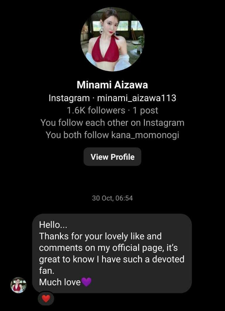 这是某位读者来信投书,我们先来讲一下他的基本资料,他是相沢みなみ(相泽南)的忠实粉丝,不过因为工作很忙,所以他从来没有参加过活动,每天就是在网路上看她的社群发文按赞;有一天,他突然发现自己在IG上被「minami_aizawa113」追踪,对方还敲他说感谢长久以来的支持:很文博客-https://www.hinku.com/51816.html