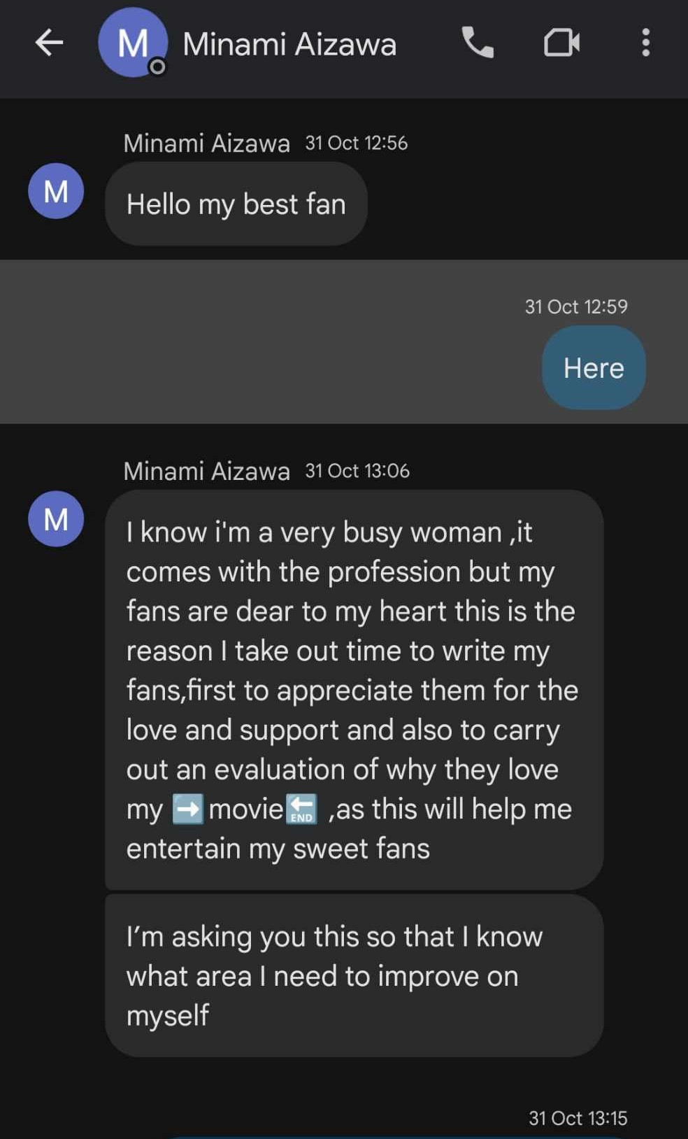 干,这就是诈骗了,非常感谢这位粉丝熬到这个阶段终于搞清楚这位「minami_aizawa113」到底在打什么算盘,至于为什么明知道对方是假帐号还要聊下去?相信有些朋友也看出来了,这个假帐号非常专业,基本上你能查到的资料她全部对答如流,她可以侃侃而谈各个活动的细节,也知道引退后相沢みなみ(相泽南)想往港台演艺圈发展的意愿,甚至连小南用英文聊天时会拼错字以及非常口语化的习惯也模仿得维妙维肖,让人忍不住就跟她聊下去了⋯