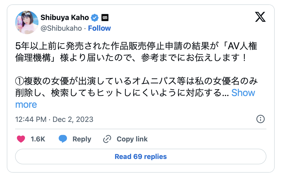 这件事现在有后续,Shibuya Kaho在X发文,目前是有3种状况:很文博客-https://www.hinku.com/52227.html