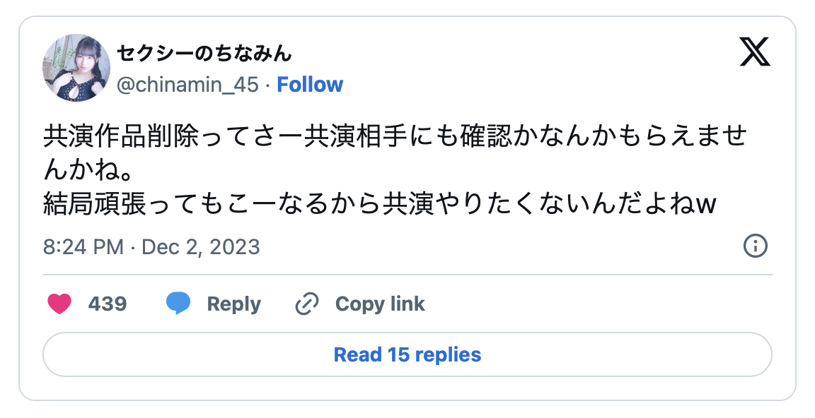 我再一次表达立场,对Shibuya Kaho下架作品我没有任何意见,但看不顺眼的人可不只哈比人男优にしくん(西君)一个,另一个女优桜ちなみ(樱千奈美)就在自己的X上这么说: