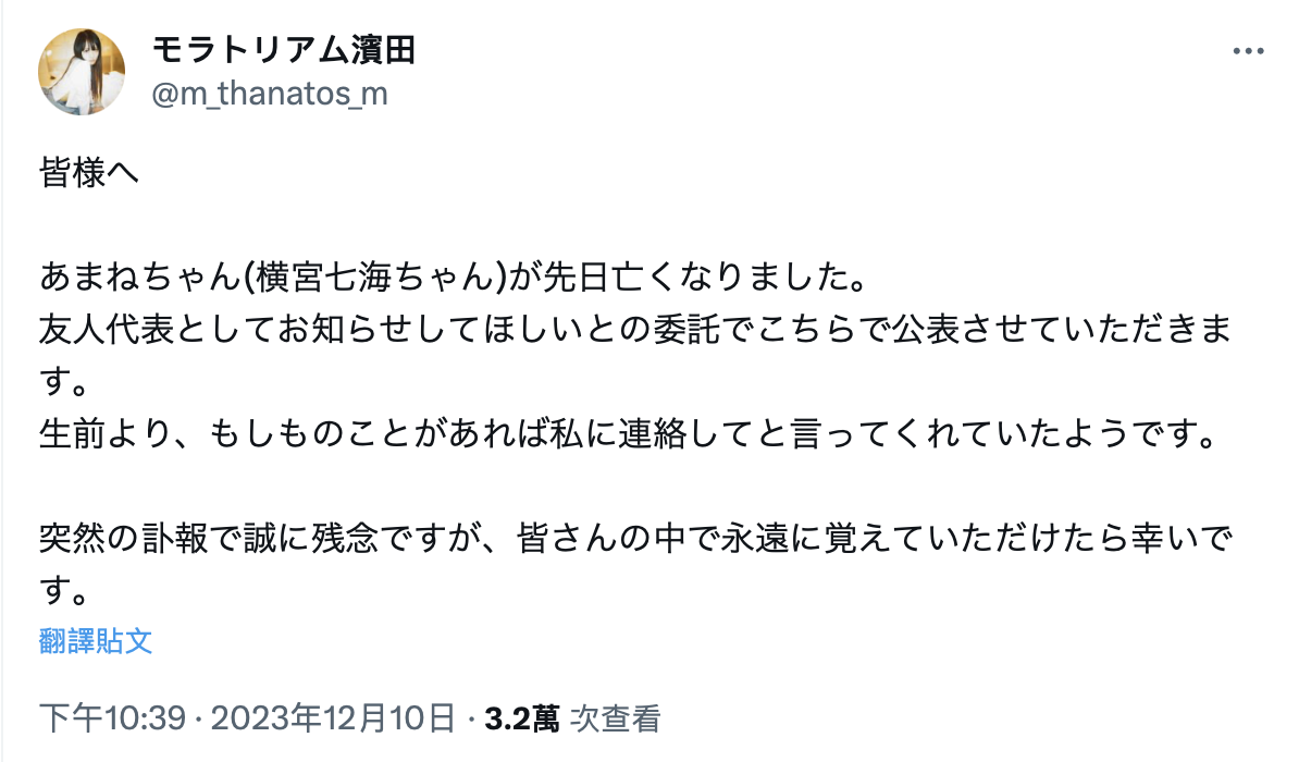 片子还是有出,但社群完全没动静了,也让不少人开始担心她的AV生涯是不是出了什么状况,不过昨晚在X上,友人モラトリアム濱田(https://twitter.com/m_thanatos_m)代为宣布橫宮七海(横宫七海)在前几天去世了,葬礼或参拜等的形式目前还没确定,也不清楚她的家人打算怎么做⋯很文博客-https://www.hinku.com/52603.html