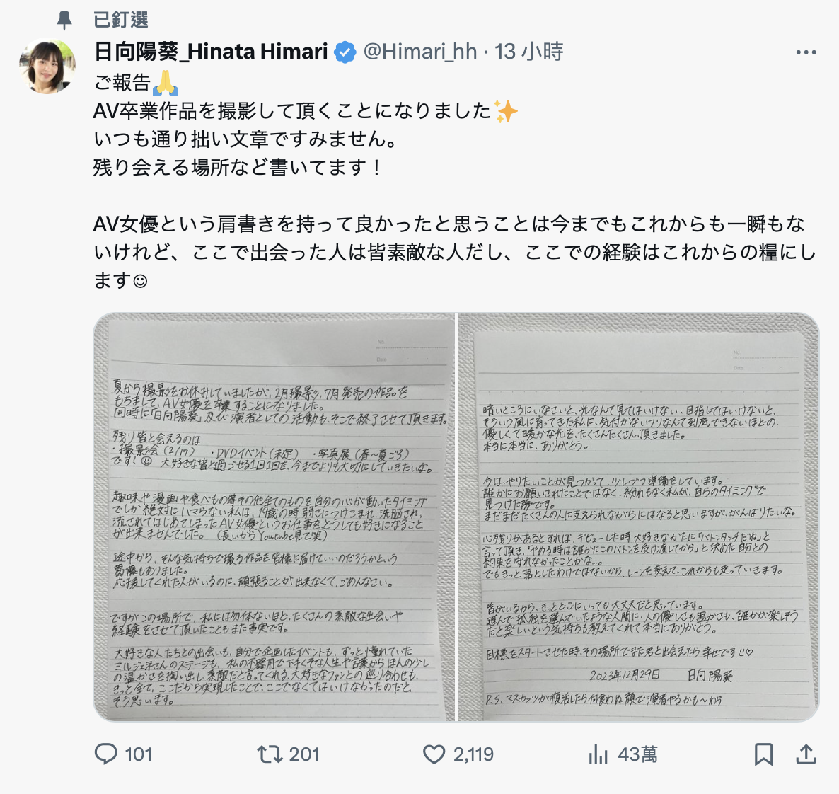 好吧,如此一来日向陽葵(日向阳葵)的动向就确定了,我觉得她很够意思了,从这阵子在社群的发言就知道她对AV界没兴趣了,而在公布AV毕业的长文中她也提到自己从来没有喜欢过AV女优这份工作,但运气很好的是在这一行遇到很多好人好事,让她可以待了这么久;至于毕业的最主要原因是找到自己想做的事,不过在AV女优的工作还没结束前她口风很紧,只说还在准备中,希望之后大家继续支持她: