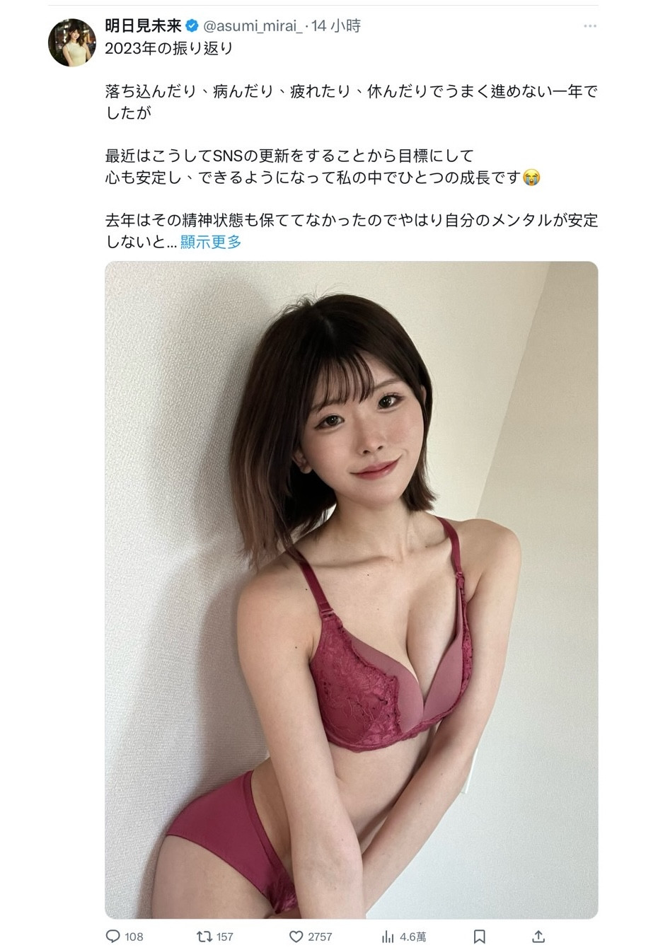 相信大家都注意到了,最近明日見未来(明日见未来)更新社群的频率变高了,理由很简单,她自己也说前一阵子因为心情没有那么稳定,再加上对未来很迷惘,一直在考虑是不是要在这一行继续待下去;不过最近她想清楚了,自己还是喜欢这份工作,也还想再拼下去,所以2024年她会好好努力,认真拍片、也希望多接一点活动,想要做出更好的成绩!