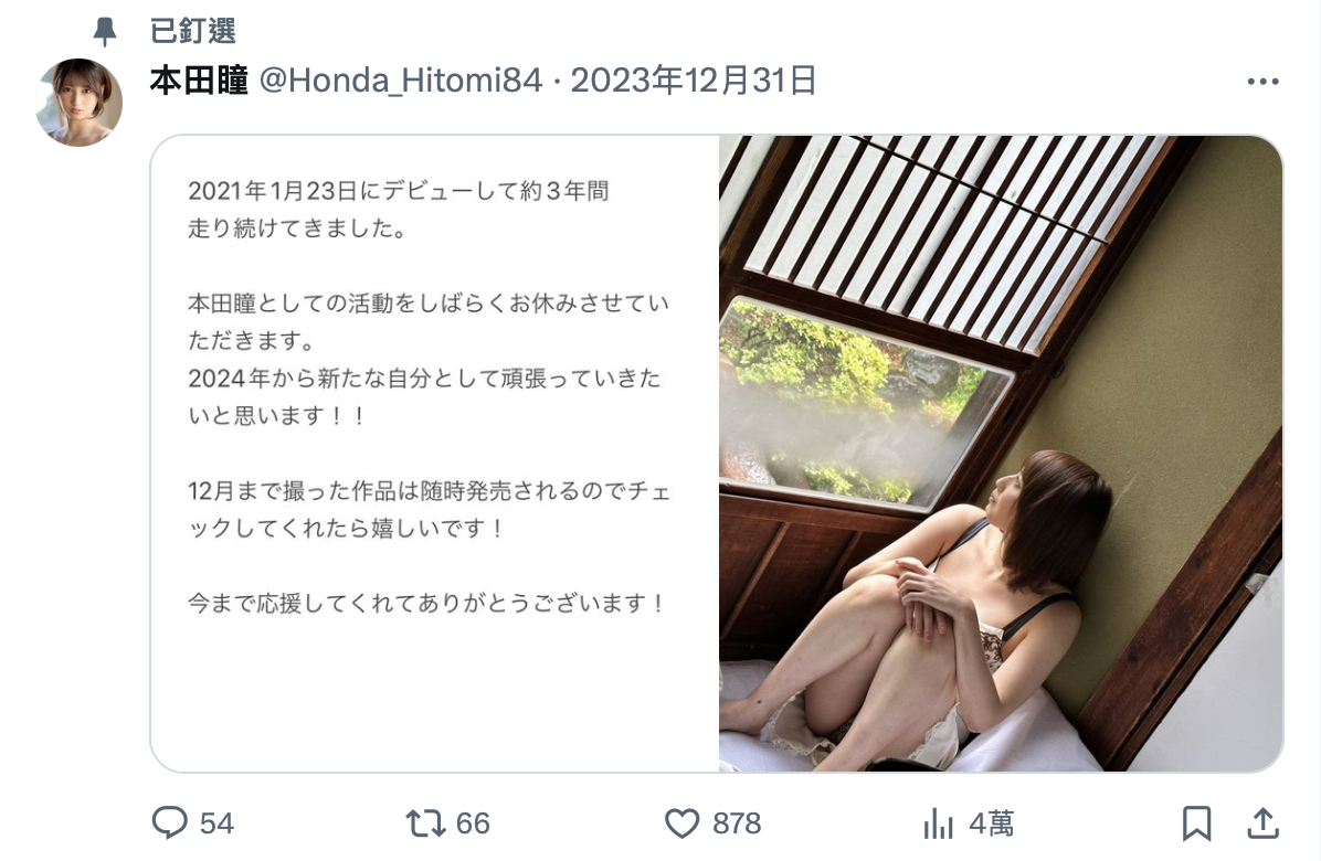 为什么说不一样呢?因为整篇声明本田瞳完全没提到「引退」两字,只说自己要暂时休息一下,也许这是说话的艺术,因为不说再见只是暂时休息那就有机会再相逢,只是这一休不知道要休多久就是了;但换个角度而言,本田瞳没说引退,只是暂时休息一阵子,这么直白的说法还有一个可能ー很文博客-https://www.hinku.com/53985.html