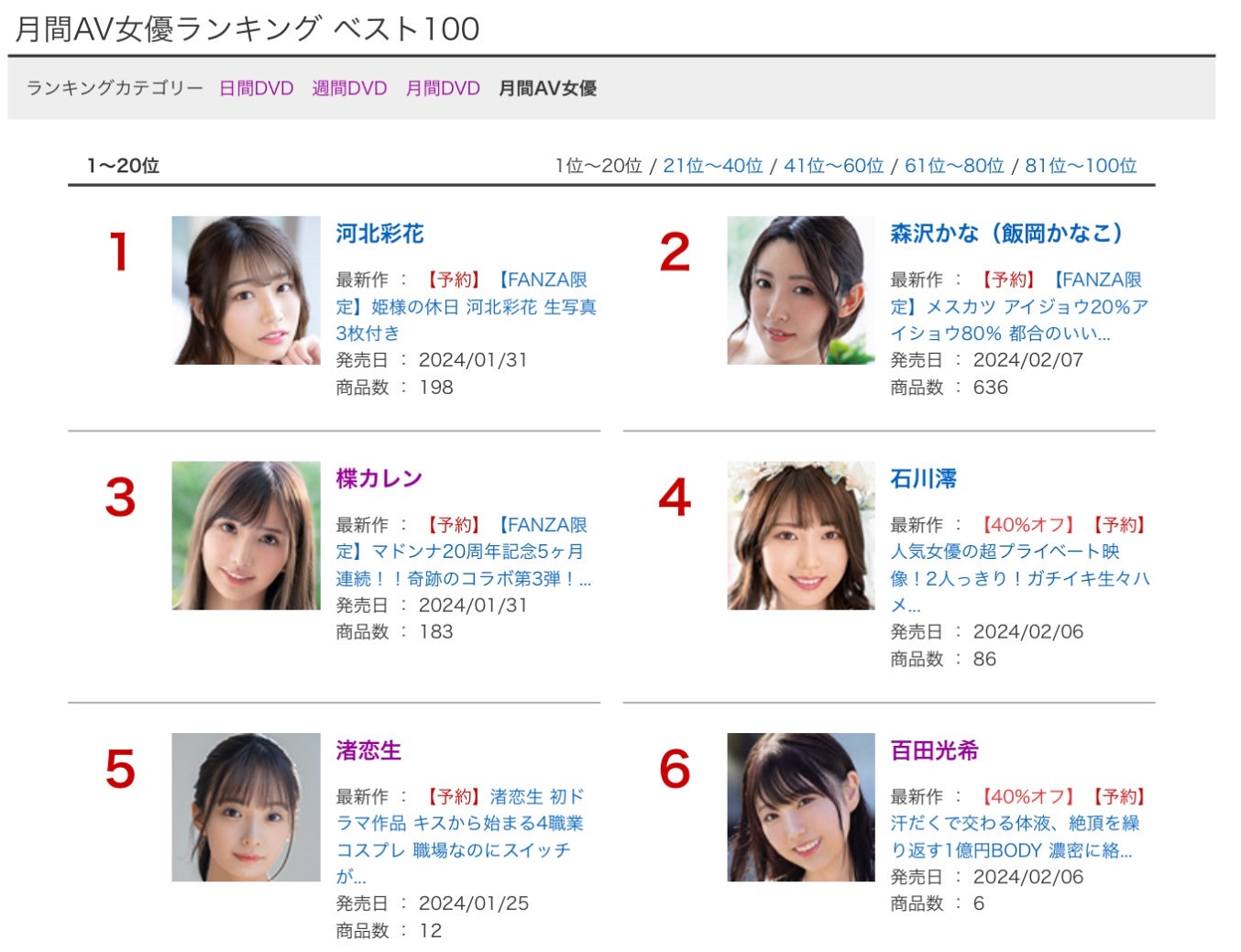 再来就是销售了,撇除第一支作品的新人效应,百田的第二支作在FANZA实体销售排行榜的表现仍然很不错,12月排行第9,AV女优累积销售排行第6;新片上架后本周排行榜18和19(蓝光版和DVD版)虽然略有下滑,但第二支作品的买气还是不错,一者排行24(DVD)一者是第67名(蓝光),以近来新人和强片之多,我认为百田的表现应该符合Moodyz的预期,不是雷声大雨点小: