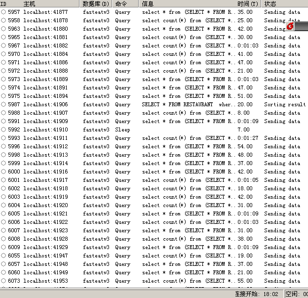 记得以前发生过一个问题也是检查了好久都没解决的,故障一发生CPU就跑到100%左右,系统没响应,MYSQL、JBOSS进程死。当初是通过对一些大数据表建立索引解决的!这次问题现象和这个有点象,死的时候几乎服务没有响应,通过查看后台MYSQL进程,居然已经超过我设置的1000个限制,第1天我把配置改成3000,想想是否跟这个有关,最近的访问量增大了。说实话,我还是不相信并发1000个连接,但事实摆在面前,现在就是1000个进程堵在这!第2天发现3000也不行了,在进程列表中看到基本上很容易就进程满,而且每个进程都在sending data 状态,查找了2天还是无法解决问题,不论是重新配置启动参数还是检查外来攻击都无法解决,按照一些人的说法,把临时缓冲表增大到512M也是没有任何帮助。象这种的每增加个连接都几乎会卡死,而且是sending data 状态!是数据无法发出还是查询不能完成呢?