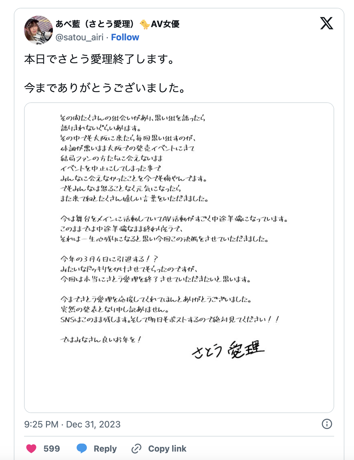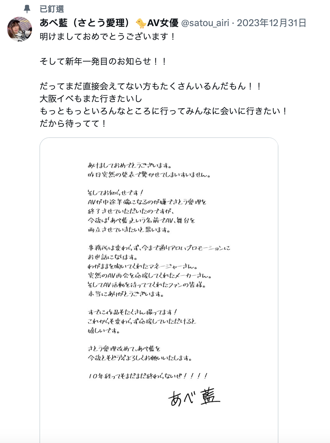 虽然有人说朝令有错夕改又何妨,不过さとう愛理(佐藤爱理)真的是装肖仔,所以我的第一个想法是她该不会是用引退的手段换事务所吧?结果她又说了,自己并没有更换事务所,仍然是ALOHA Promotion的人;而换了名字后她仍然是AV和舞台剧并行⋯