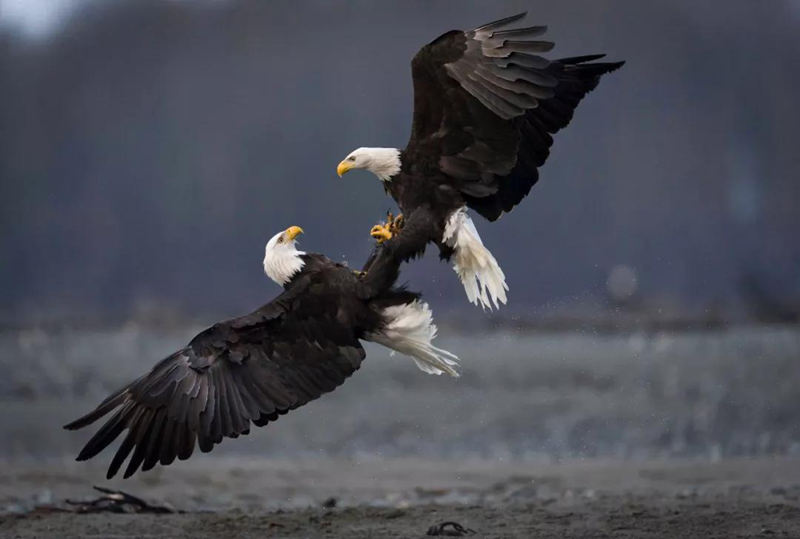 一对白头鹰。白头鹰通常被认为是一夫一妻制,不过当伴侣意外身亡后,它们并不会从一而终。