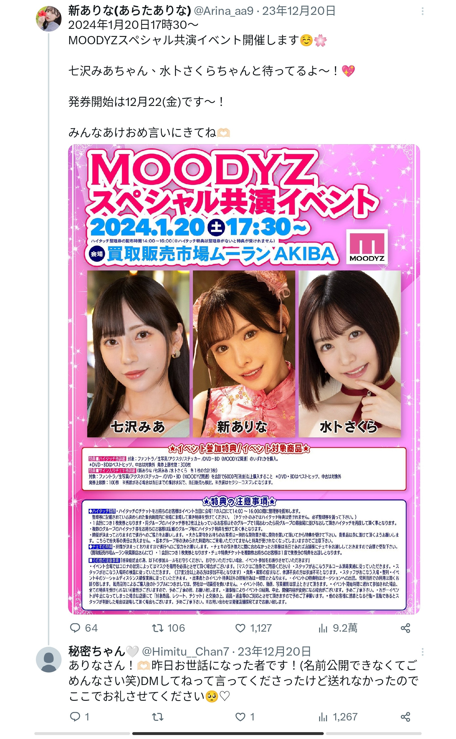 秘密酱已经在某个场合与事务所的大姐大新ありな(新有菜)见过面了,因为新酱没有开放X私讯,所以她是直接留言感谢前辈的照顾