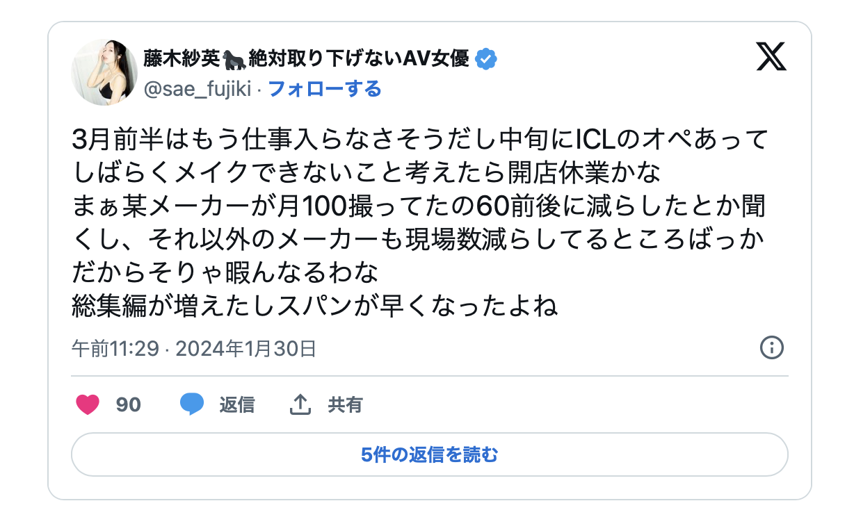 消息来源是女优「藤木纱英」的X(https://twitter.com/sae_fujiki/status/1752172080429482358),她说自己听到过去某家每个月会发100支作品的片商现在下滑到只拍60支左右,其他片商也都减少了拍摄作品的数量,取而代之的是更多的精选辑〜很文博客-https://www.hinku.com/55199.html