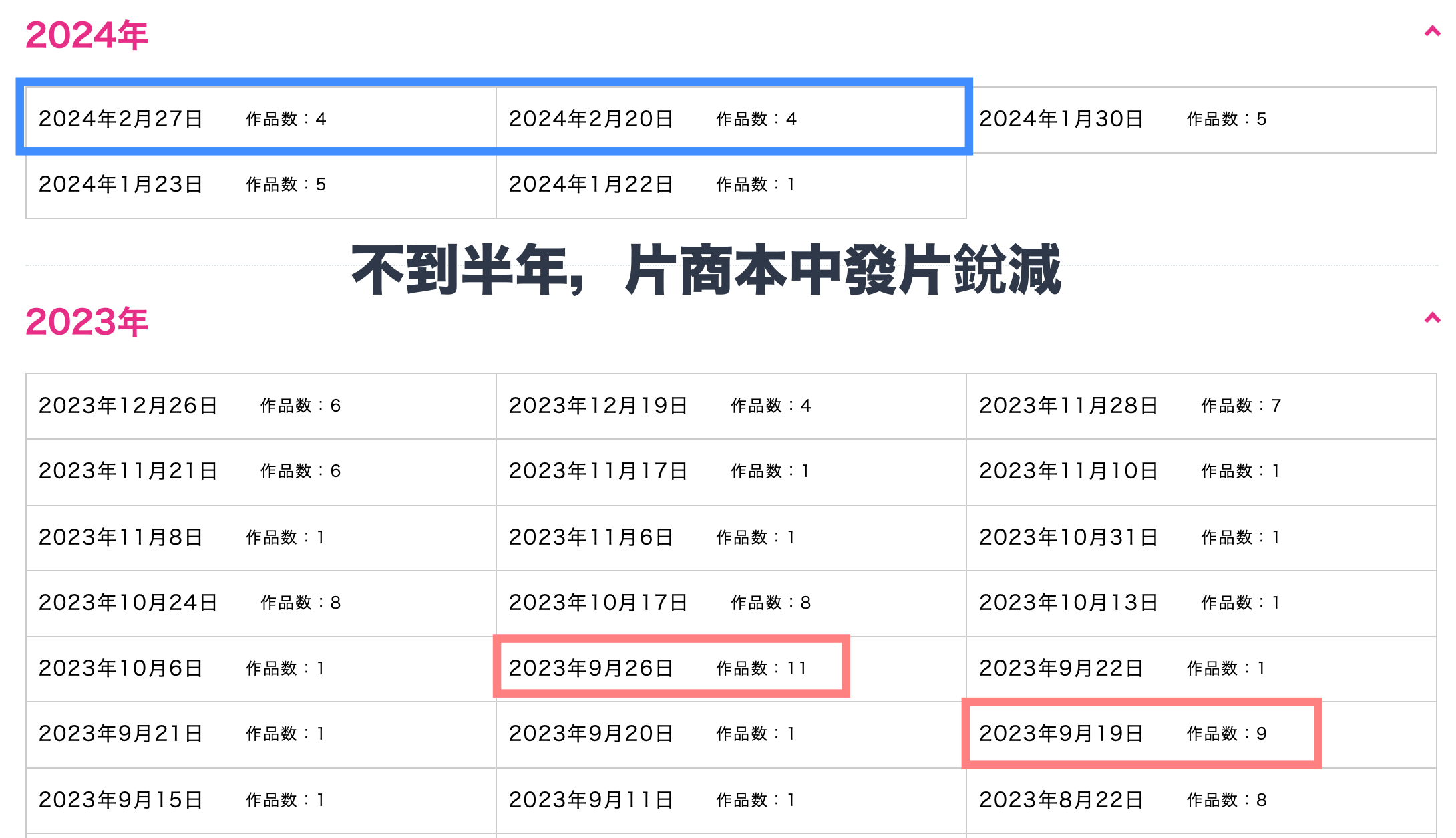 再来,还是新法的影响,由于新法让业界步调大乱,所以大家应该还记得之前片商发片量锐减,好不容易过了一段时间才调整回来;但其实调整的过程中片商是先消化之前在新法刚实施时被喊卡的拍摄计画,这也让2023年有段时间发片量暴增,而现在只是回归正常,此其二也。