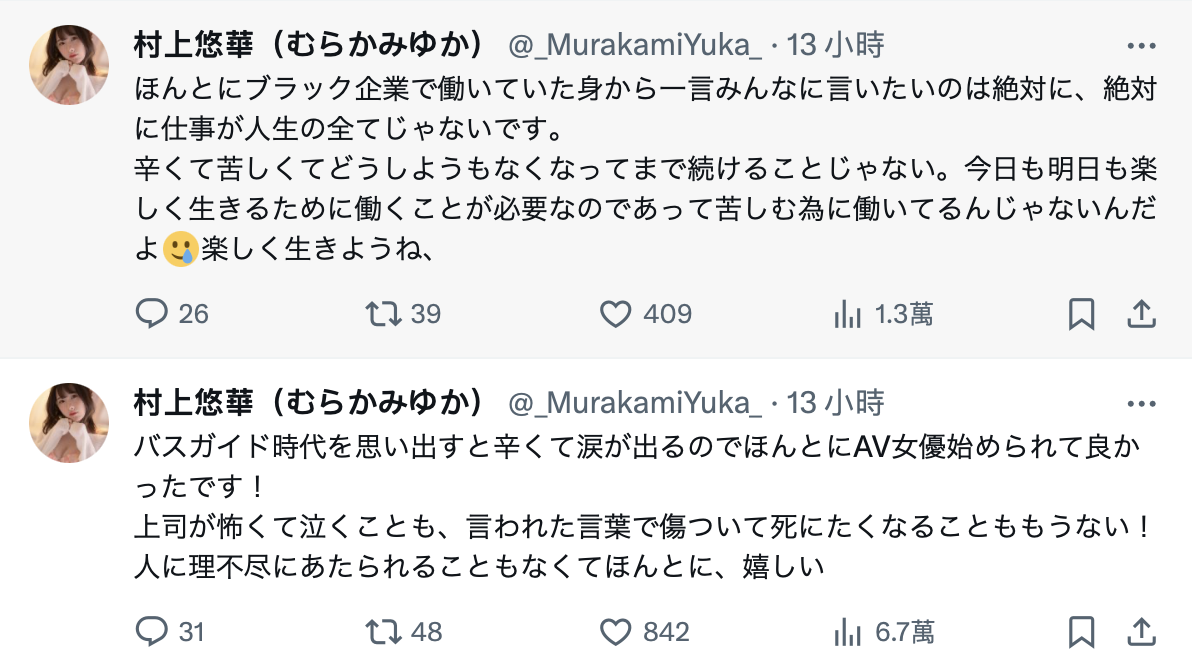 这想法很正确,我也常常和朋友这么说,既然是去当社畜的那就要当快乐的社畜,每天上班都愁眉苦脸的那是会生病的;而果断决定不做的村上悠華(村上悠华)转职为AV女优又有什么感想呢?她在X上是直接用三个字这么说:
