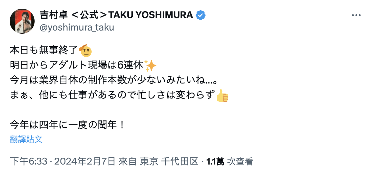 只可惜就如之前女优的爆料,近来片商拍摄作品的数量减少了,所以吉村大叔在2月7日的时候于X(https://twitter.com/yoshimura_taku)说自己要6连休(6天没有工作),其实从各方面都能闻到2024年可能新片数量会掉很多的味道,大家可能要做好心理准备~