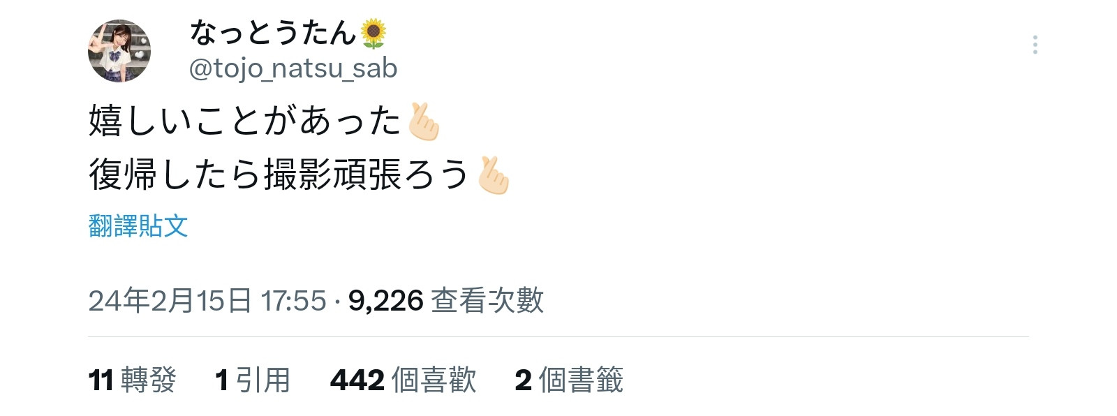 不过東條なつ(东条夏)不太一样喔:虽然休业了,但她的X不管是主号还是小号都有在更新,而且和刚休业的时候不同,東條なつ(东条夏)从去年年底左右就没有再用库存的档案照而是刚出炉的新鲜写真,那时候就有人在猜她快回来了〜很文博客-https://www.hinku.com/55787.html