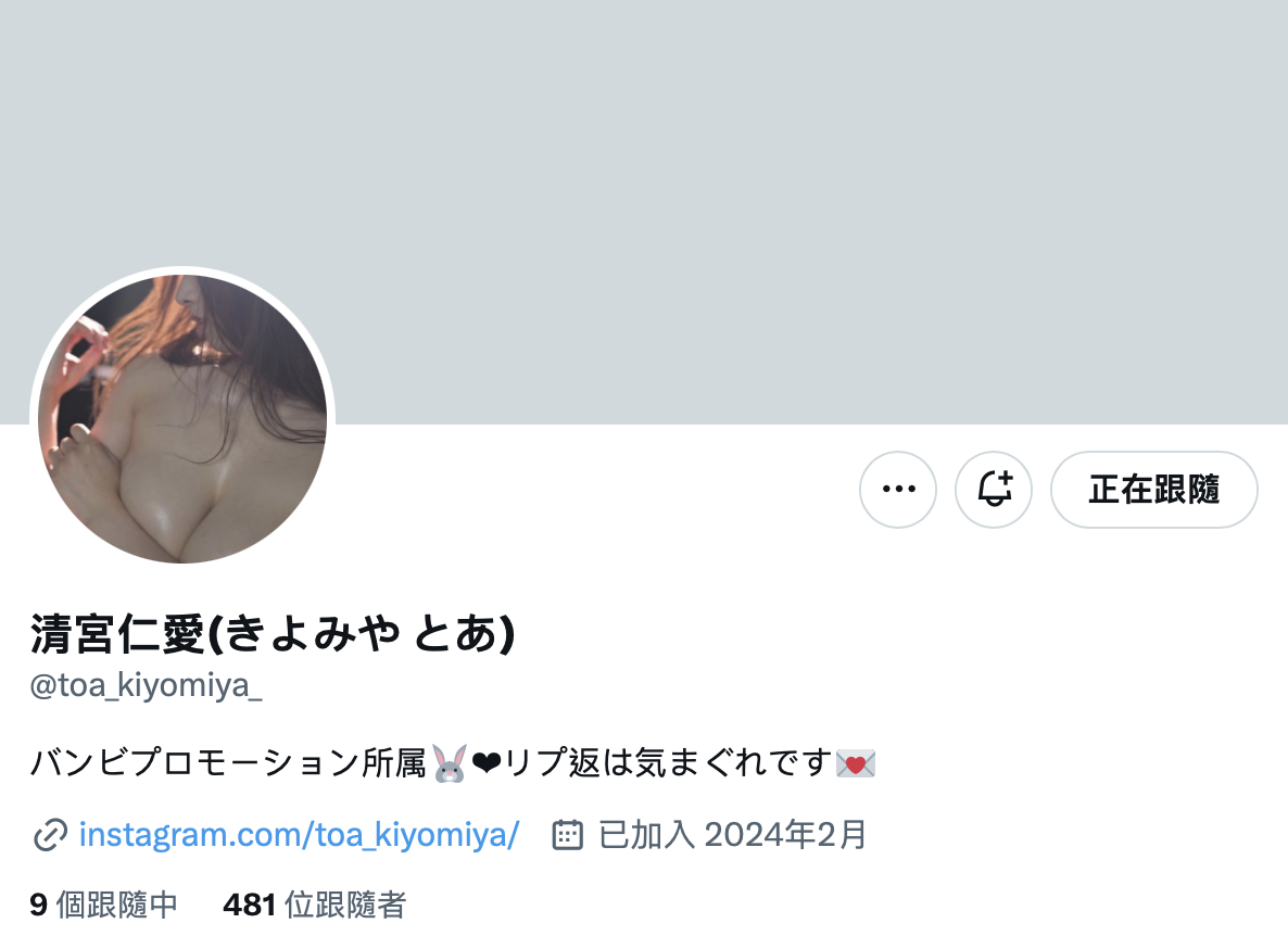 没关系,要找她的长相一点都不难,虽然X找不到但到了IG(https://www.instagram.com/toa_kiyomiya/)清宮仁愛(清宫仁爱)就什么都给你看了: