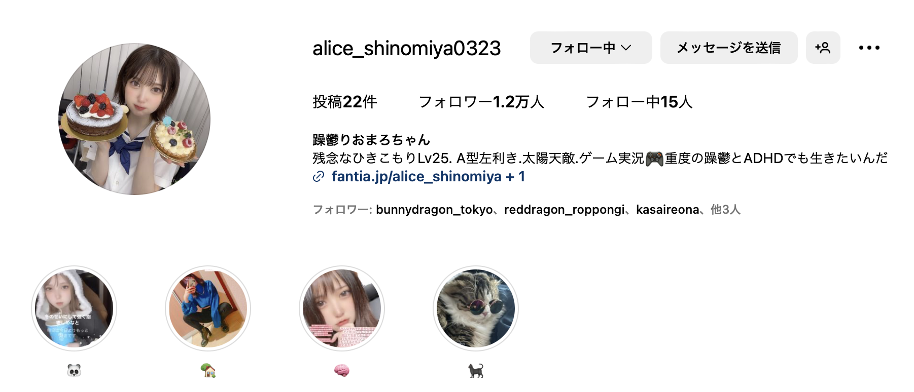 大家可以看到,她现在已经把艺名改成了「躁鬱りおまろちゃん」,「りおまる」是来自她在演艺圈时代的外号,ちゃん则是「酱」的意思,重点是最前面的那个「躁郁」则是告诉大家自己有重度过动的症状—从她在社群自我介绍的状况来看,四宮ありす(四宫有朱)已经不是她的主要身份了,她现在期许的是做好一个游戏的实况主: