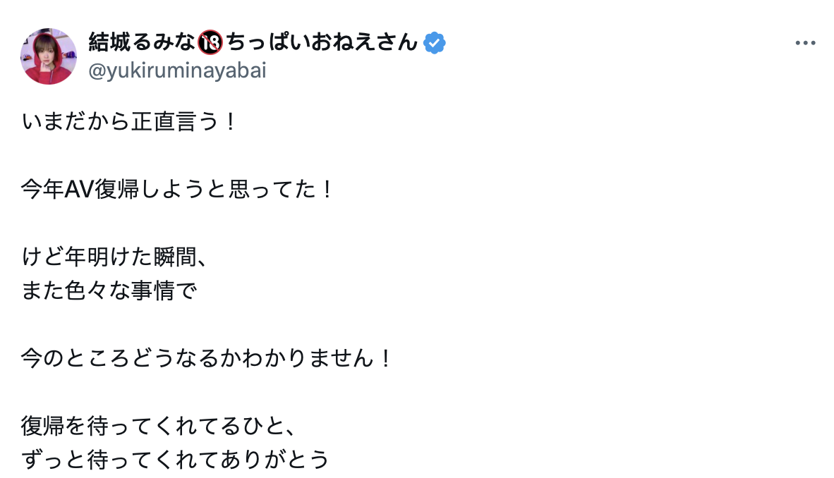 虽然这一行也曾让同样是吸毒出狱后的小向美奈子发片,甚至现在小向仍然的名字仍然掛在经纪公司カプセル(Capsule)之下可以发offer谈工作,不过結城るみな(结城瑠美奈)很明显地没有那个经济价值,所以不久前她是在社群这么说的:很文博客-https://www.hinku.com/56978.html
