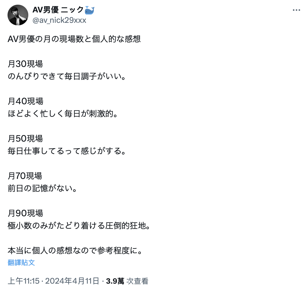这样子你就知道男优工作的状况了,还记得吗?しみけん(清水健)说只要一个月有40个现场就可以算是人气男优;而对ニック(Nick)来说一个月40个现场(就是在30天的时间和女优打了40发)是很OK的,50个现场就很忙碌,到了70个现场就会脑袋一片空白⋯
